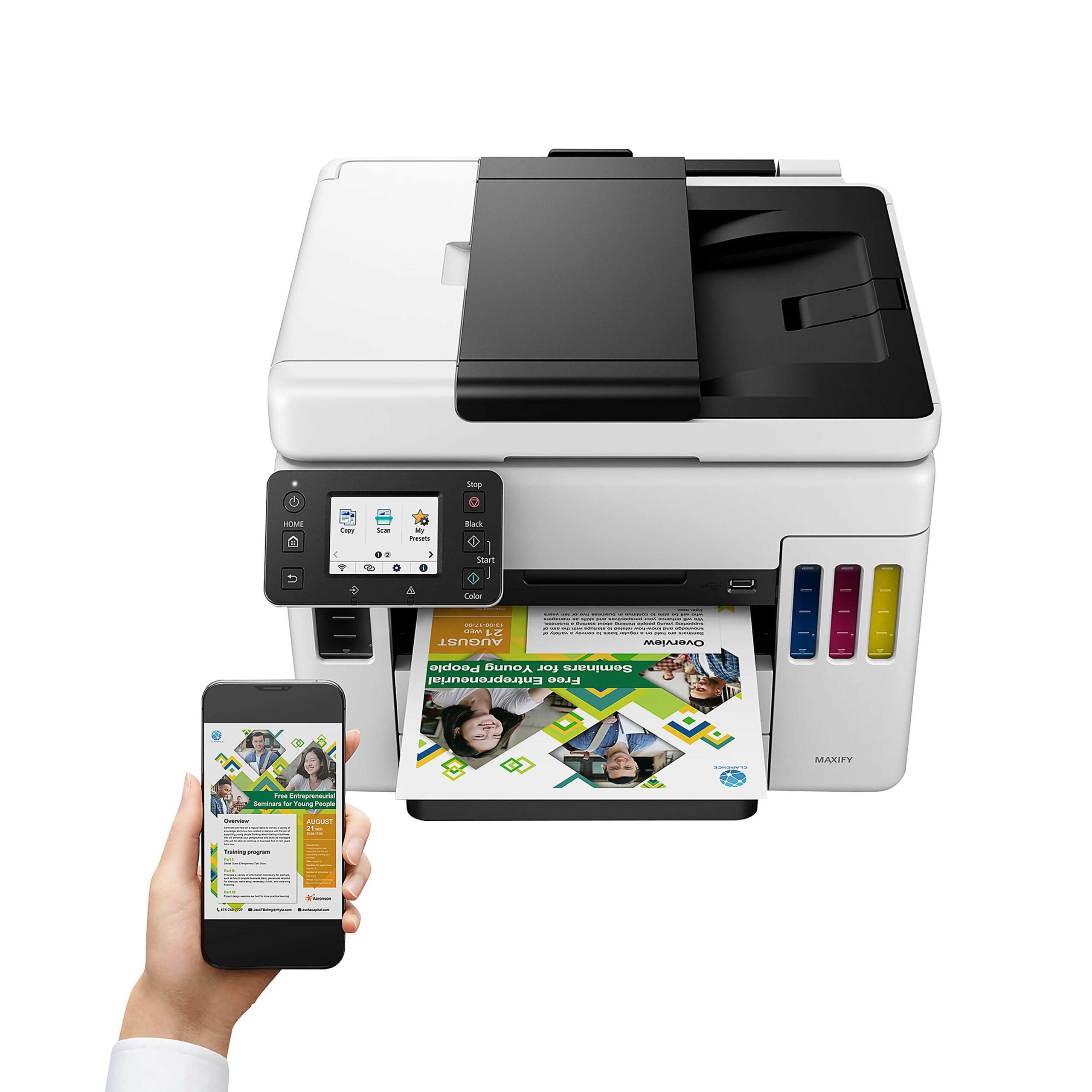 Ensure your office has access to reliable, high-quality printing with the refurbished MAXIFY GX7021 Wireless MegaTank All-In-One Printer. Featuring three paper trays with a combined capacity of 600 sheets, this printer is designed to handle large jobs without frequent tray refills. The all-in-one ink tank system, compatible with various mobile apps, allows you to conveniently print documents directly from your smartphone or tablet. The refurbished MegaTank printer utilizes pigment-based ink from keyed ink bottles to deliver crisp text and vibrant colors.